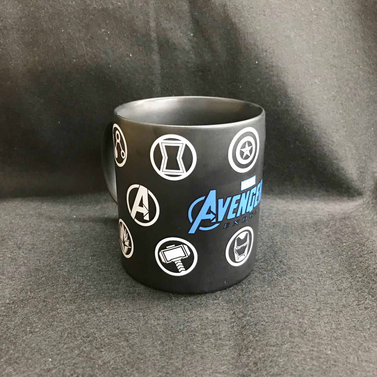 『アベンジャーズ/エンドゲーム』のロゴとアイコンがデザインされたマグカップ。
