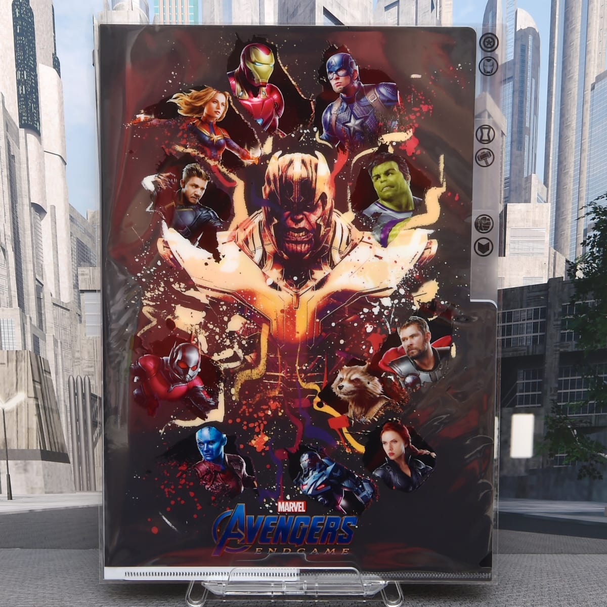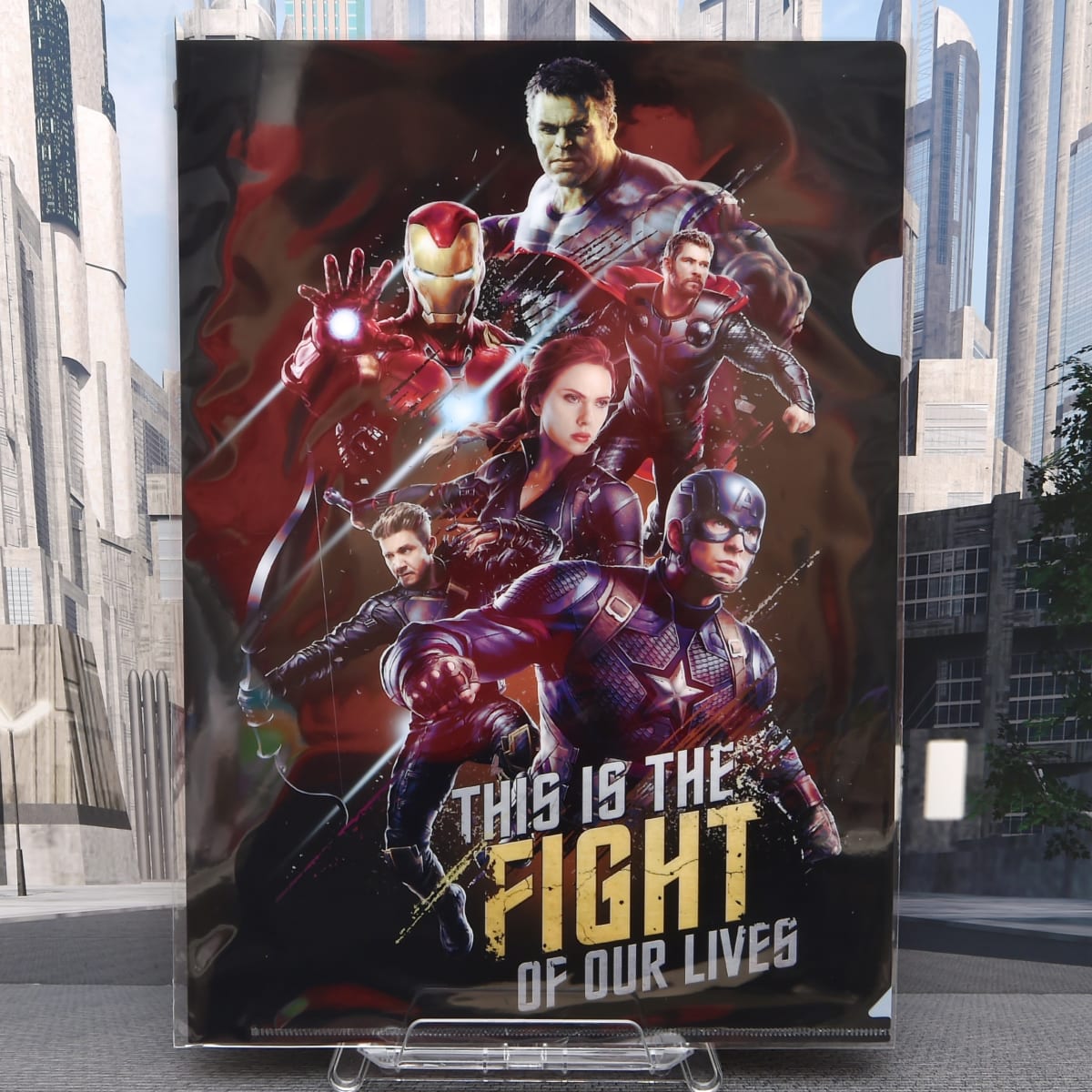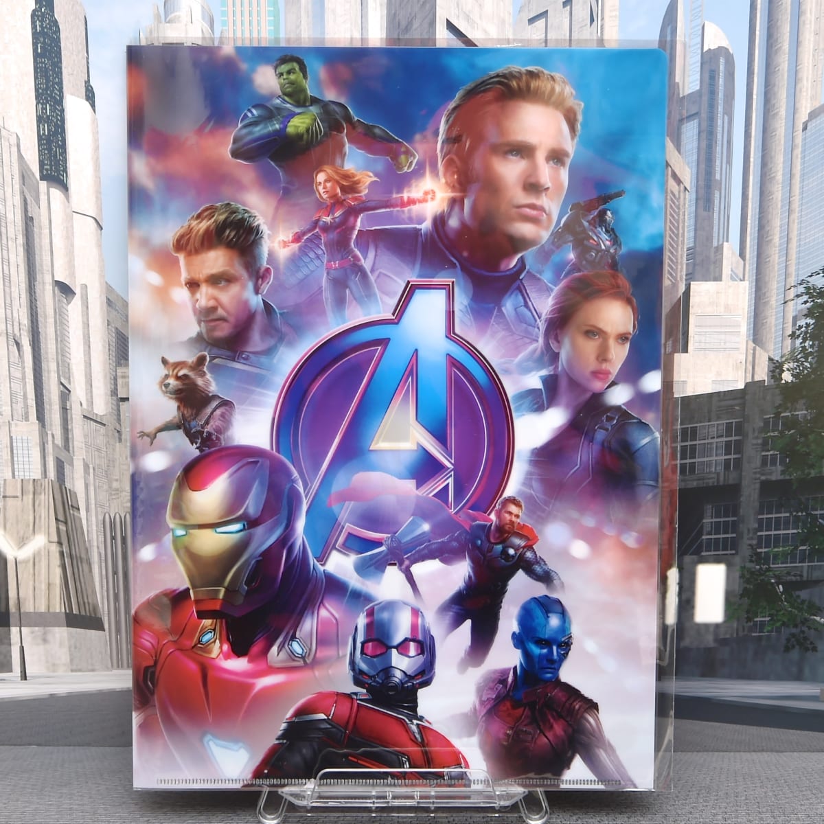 「アベンジャーズ」のエンブレムを中心にメンバーが配置されたクリアファイル。