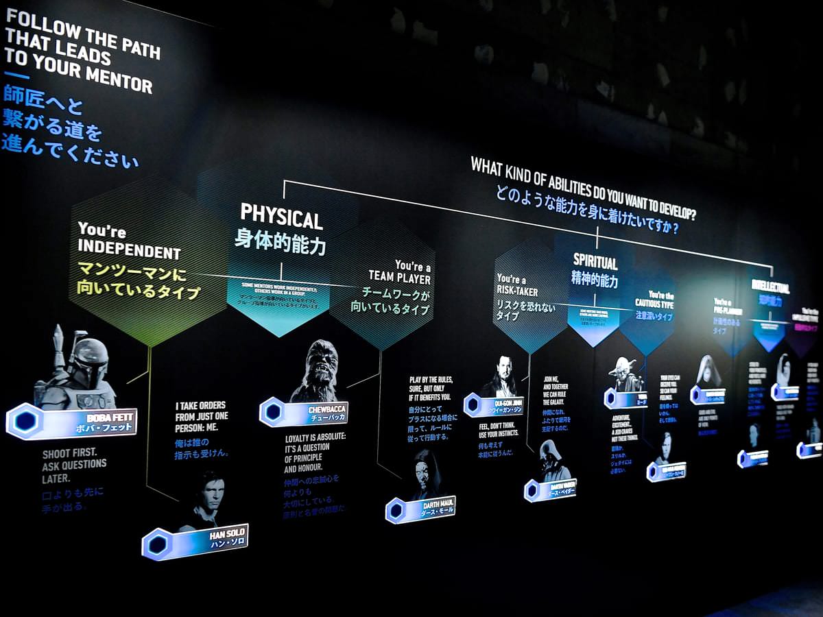 今回の展示の見どころのひとつ「アイデンティティクエスト」について、「性格診断的な、占いのような楽しみ方ができるので、『スター・ウォーズ』ついてあまり知らない方でも楽しめます。作品についても勉強になるし、自分についても知ることができます」と太鼓判!