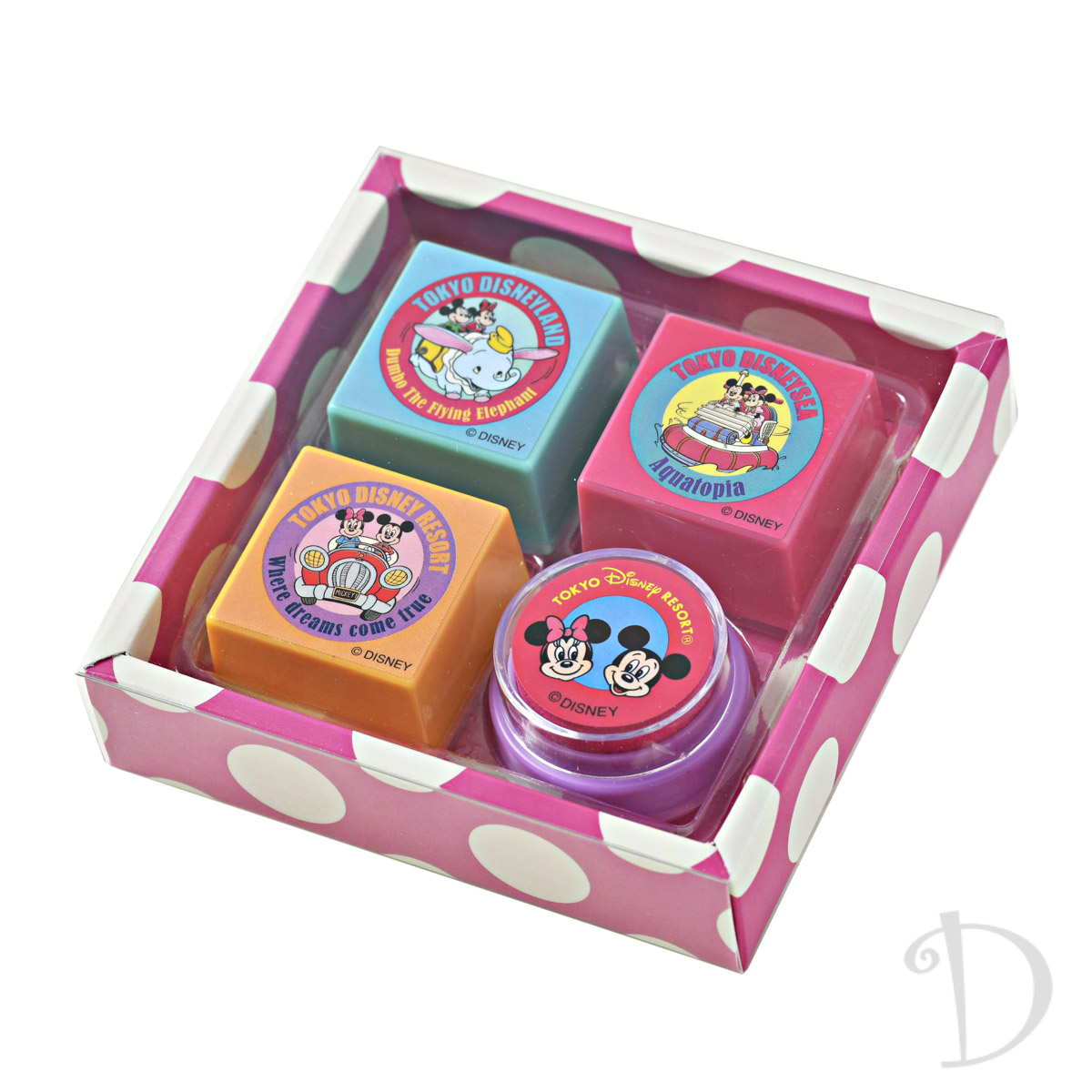 「空飛ぶダンボ」、「アクアトピア」、ドライブを楽しむ「ミッキーマウス」と「ミニーマウス」のほか、「アリスのティーパーティー」、「ヴェネツィアン・ゴンドラ」、「ピーダパン空の旅」のデザイン。