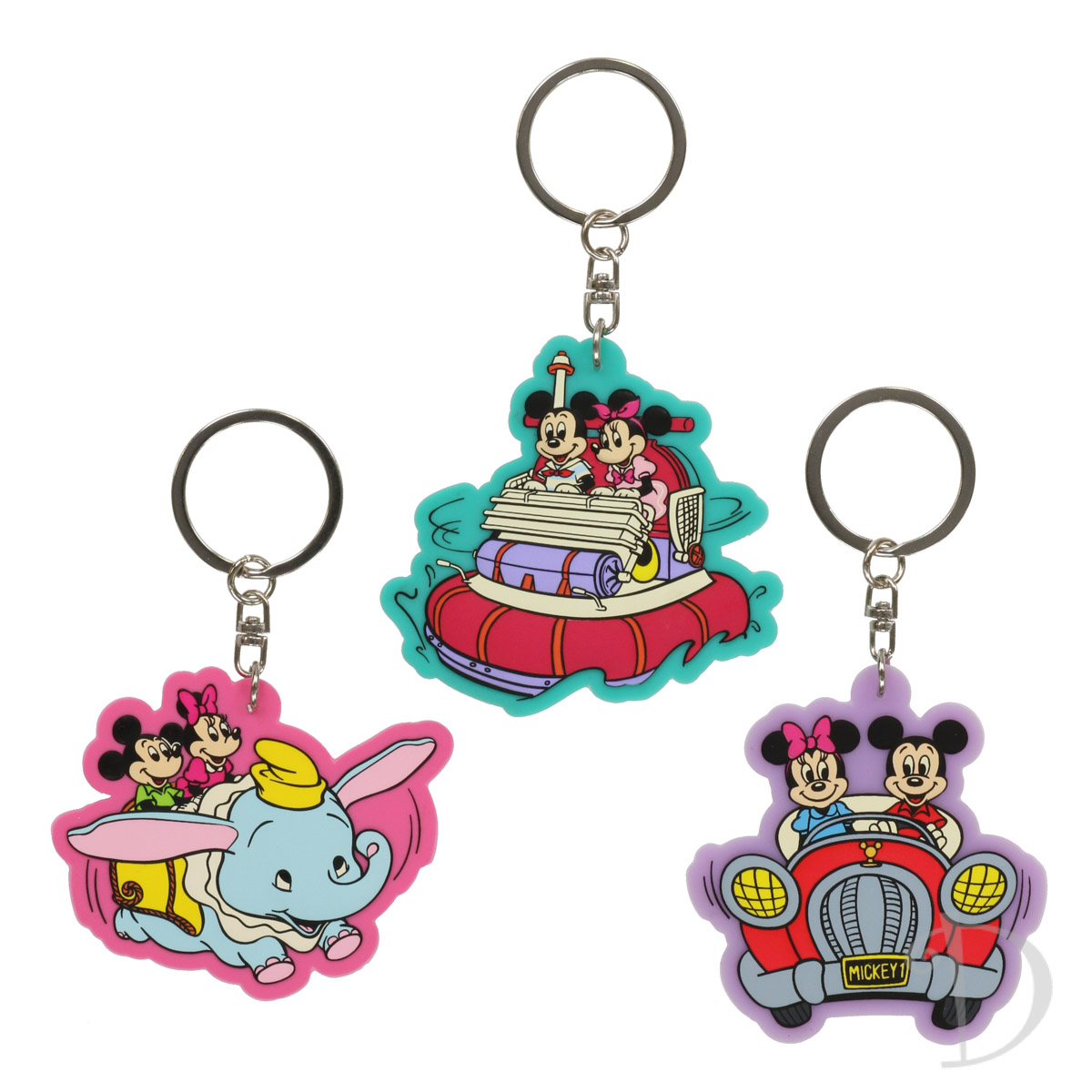 東京ディズニーランドの「空飛ぶダンボ」、東京ディズニーシーの「アクアトピア」、そしてドライブを楽しむ「ミッキーマウス」と「ミニーマウス」のキーチェーン。