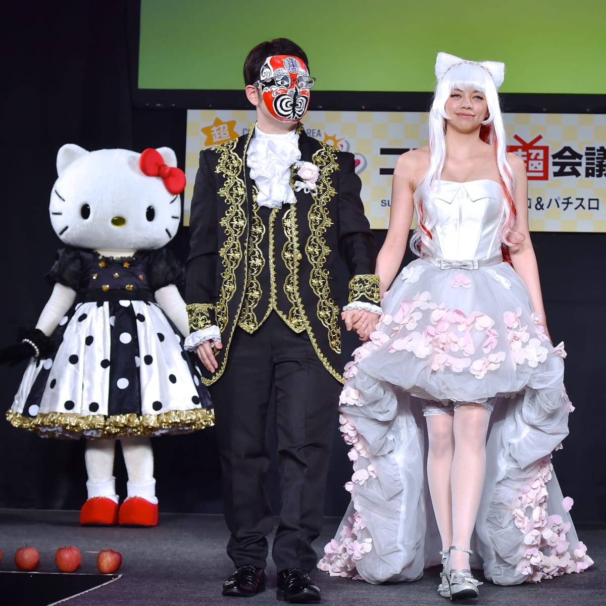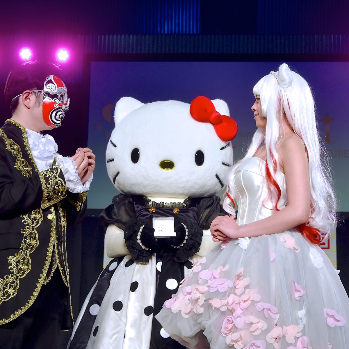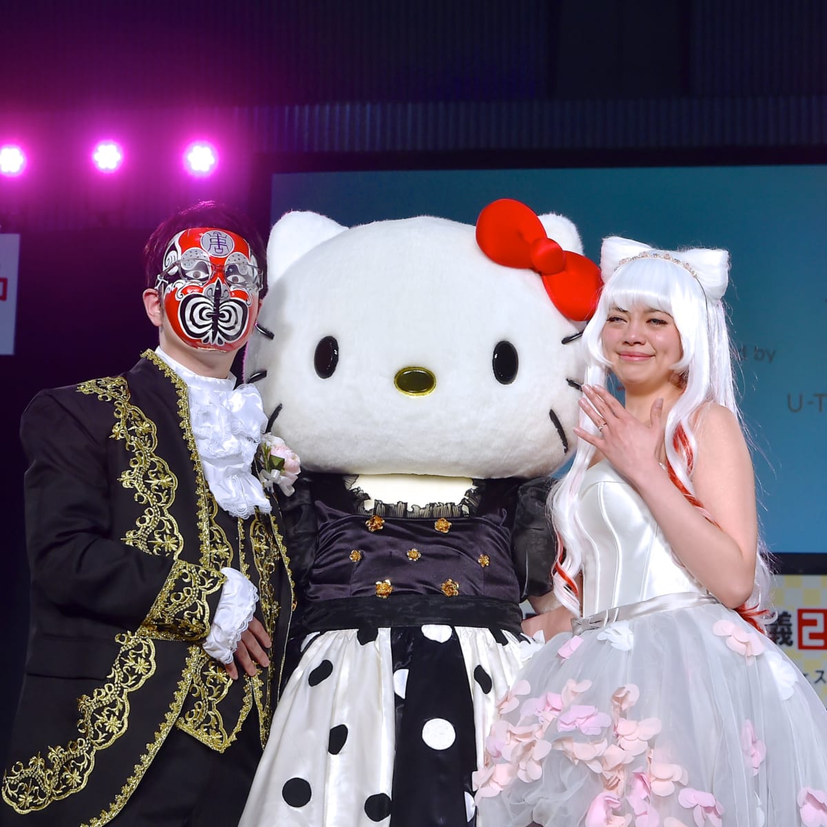 ステージに登場した新郎・新婦をあたたかい眼差しで見つめる「ハローキティ」