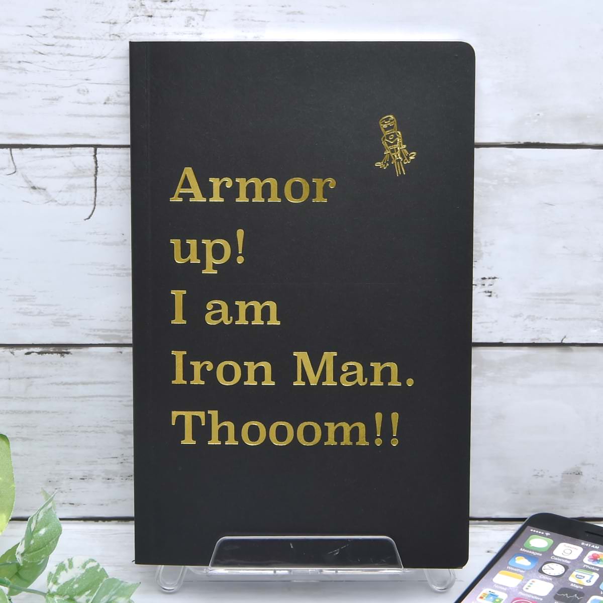 「アイアンマン」デザインの箔ノートはゴールドの箔を使用。