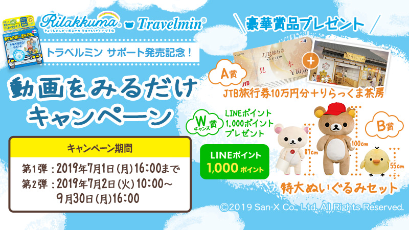 リラックマ・コリラックマ・キイロイトリの特大ぬいぐるみセットが当たる「動画見るだけキャンペーン」が、エーザイ「トラベルミン」のキャンペーンサイトにて、2019年9月30日(月)まで開催中!