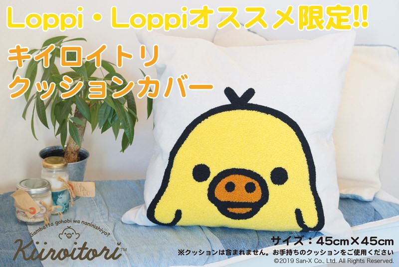 キイロイトリのクッションカバーは、2019年5月12日(日)までの期間限定で、Loppi・Loppiオススメにて予約受付中です。