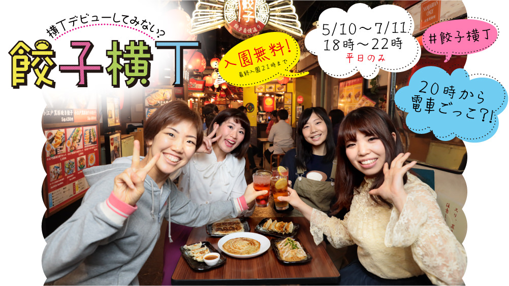 2019年5月10日(金)より、平日18時以降の入園料(大人:500円、こども:300円)が無料となり、いつもよりお得にナンジャ餃子スタジアムを楽しめるイベント「餃子横丁」が開催されます!