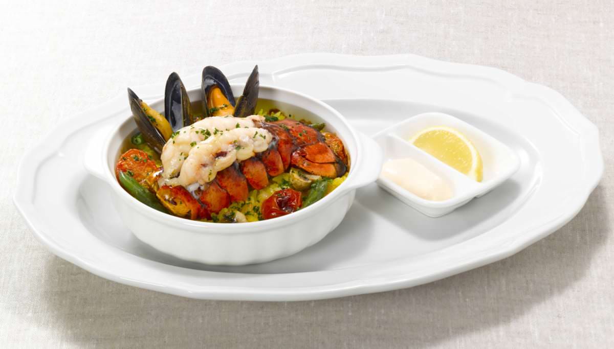 サフランライスの上にムール貝やマッシュルームのほか、インゲンやトマトといった野菜が彩りよく散りばめられ、オマール海老のグリルが一尾のっている贅沢な一皿。