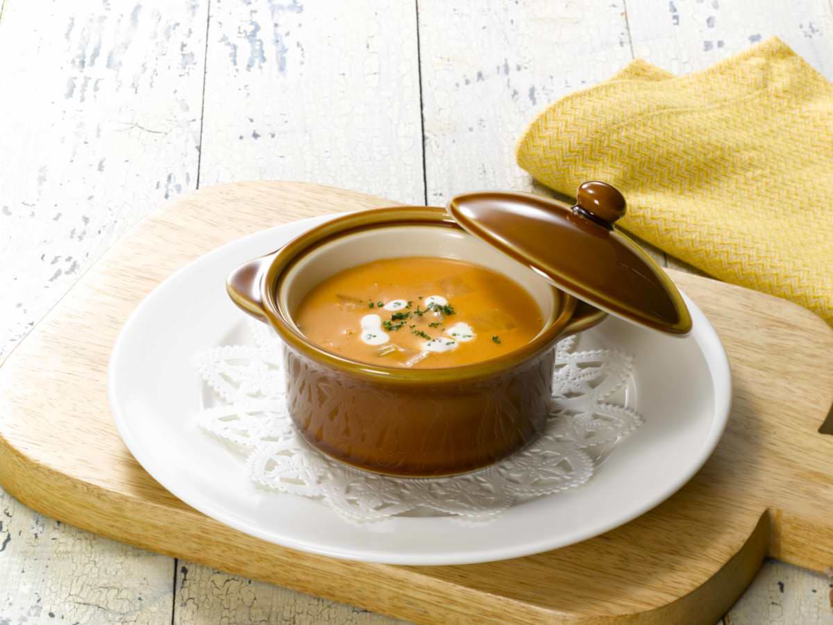 海老、蟹など甲殻類から出るうまみをベースに、フュメ・ド・ポワソン(魚介だし)や貝柱のだし、さらに牛乳、生クリームを加えたクリーミーなスープ。