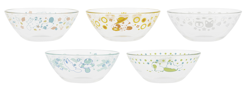 涼やかな透明のボウルに、「タヌキ」と「キツネ」のカラフルなイラストがデザインされています。