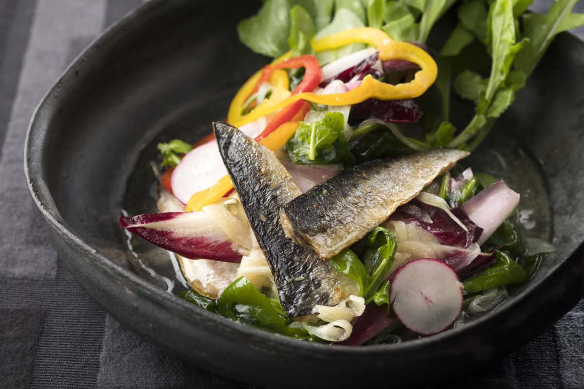 香ばしく焼き上げられたイワシにルッコラなどの野菜をあえて東金味噌のドレッシングで仕上げられたサラダ。