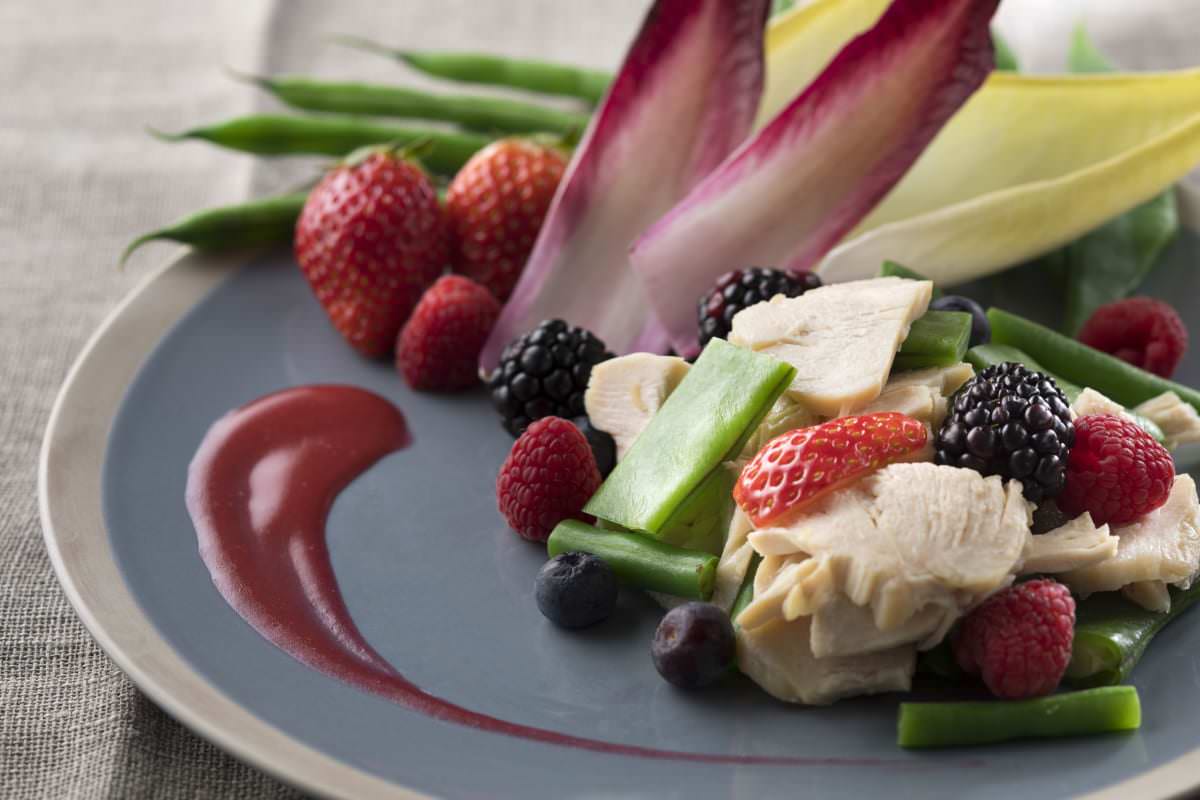 蒸しあげたシンプルな味付けの鶏に、ベリードレッシングの甘酸っぱさが絶妙にマッチするサラダ。