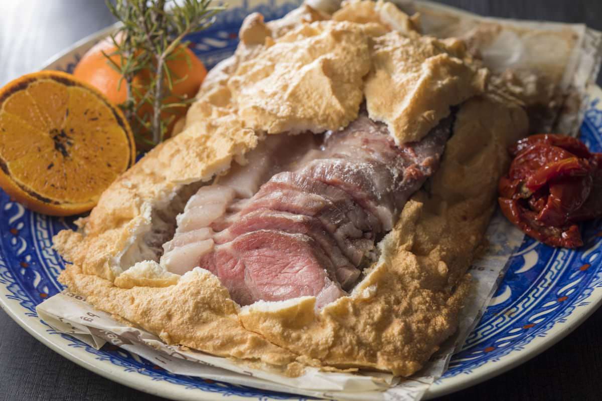 きめが細かくやわらかな肉質のポークにオレンジの皮を混ぜて香りをつけたメレンゲで包み焼き上げてあります。
