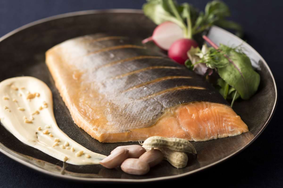 千葉で養殖した脂乗りの良いサーモンをローストし、砕いたピーナッツが入った甘いソースと一緒にいただきます。