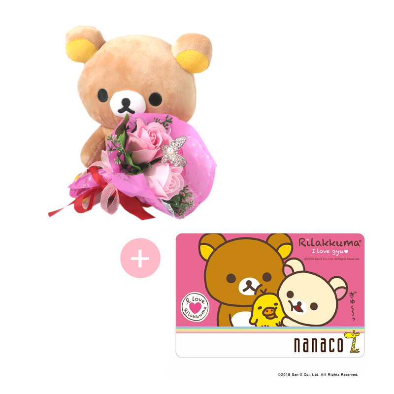 花束を持ったリラックマのぬいぐるみと限定ナナコカードのセットは、贈り物にもぴったりです。