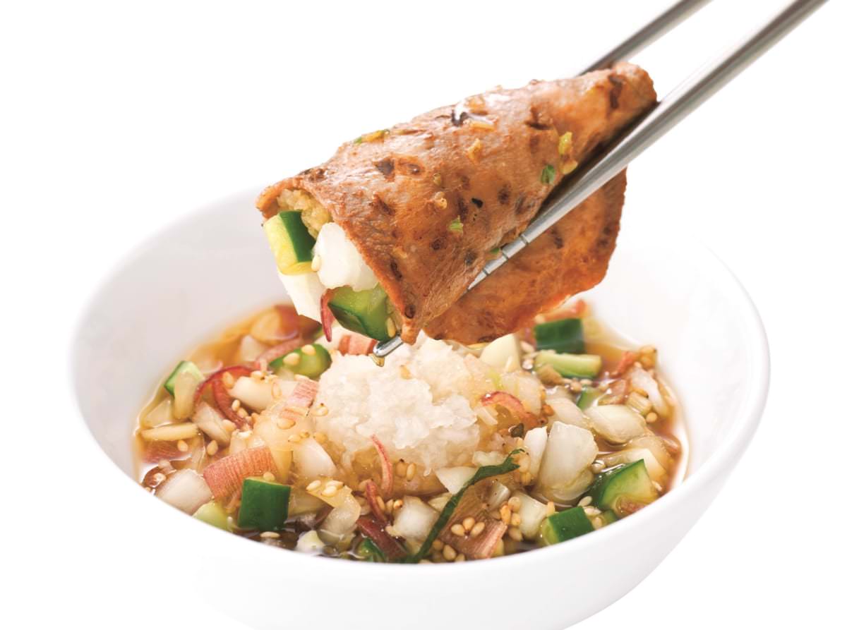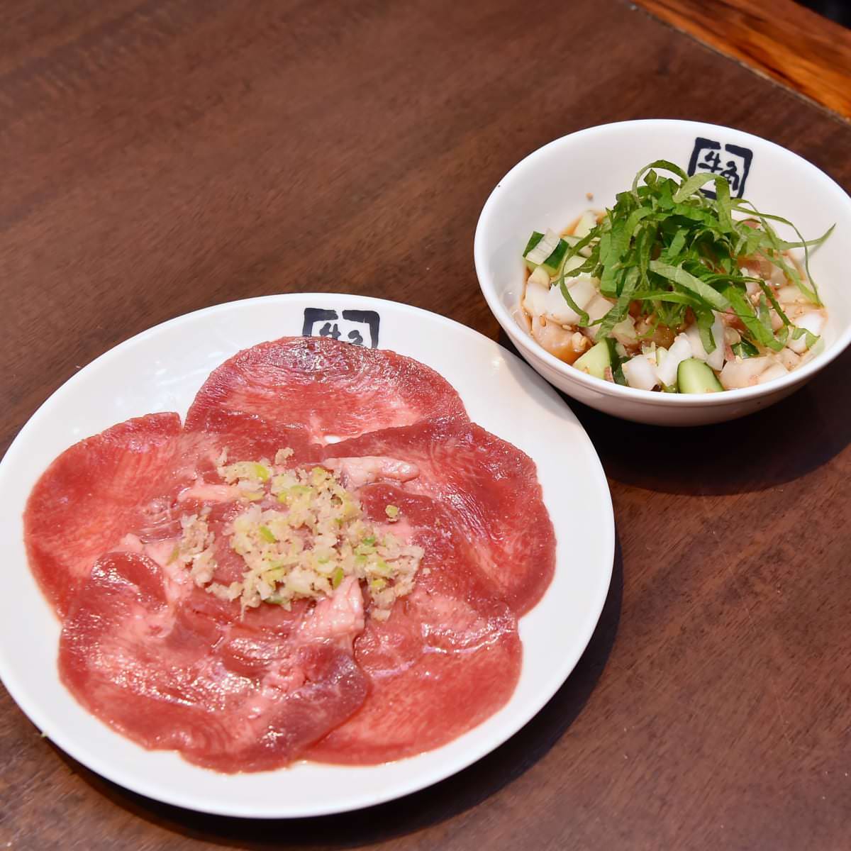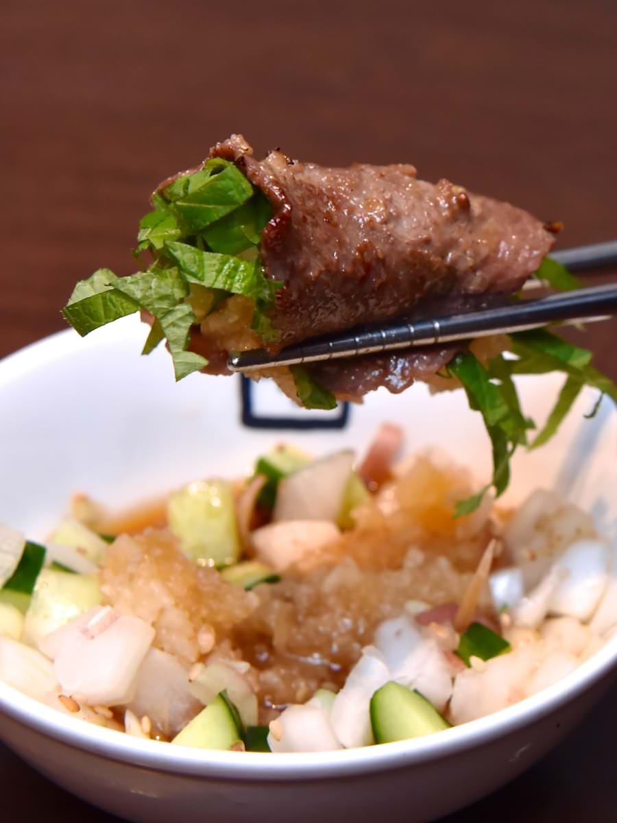 焼肉屋の特製ポン酢と香味野菜が牛タンの旨みを引き立てます。