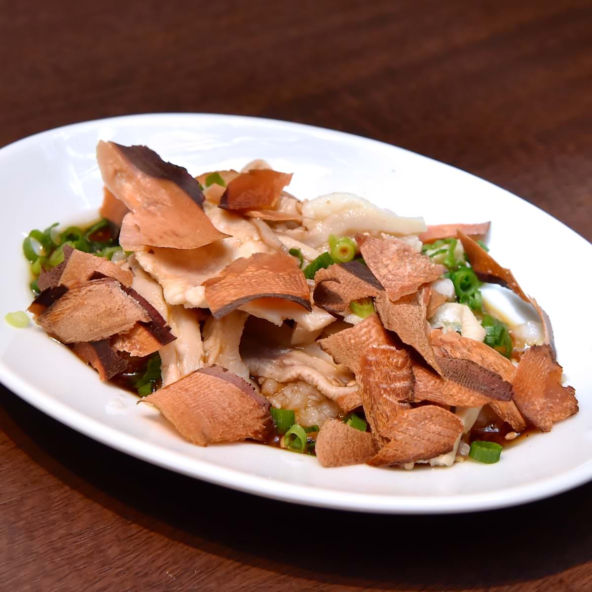 バリバリ食感のかつお節とホルモンの食感が合わさった楽しい肉おつまみです。