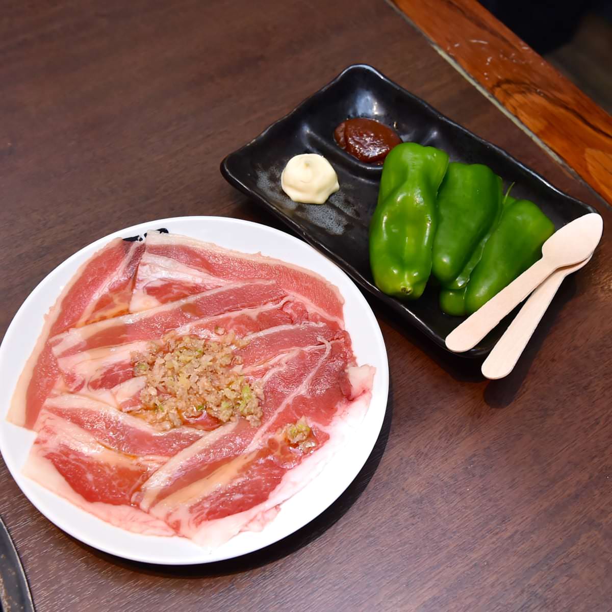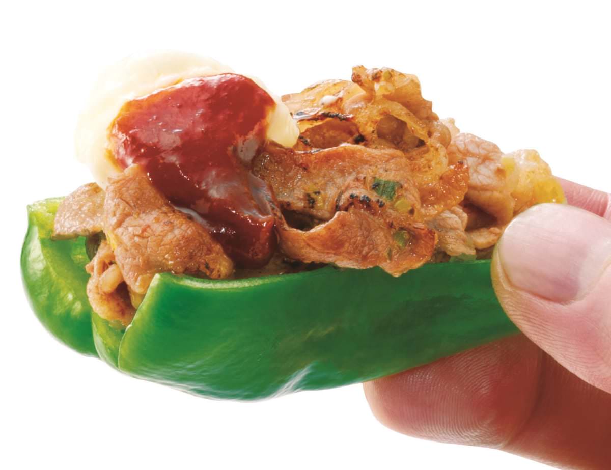 フレッシュなピーマンに焼いたカルビをギュっと詰めて、マヨネーズと特製みそでいただきます。