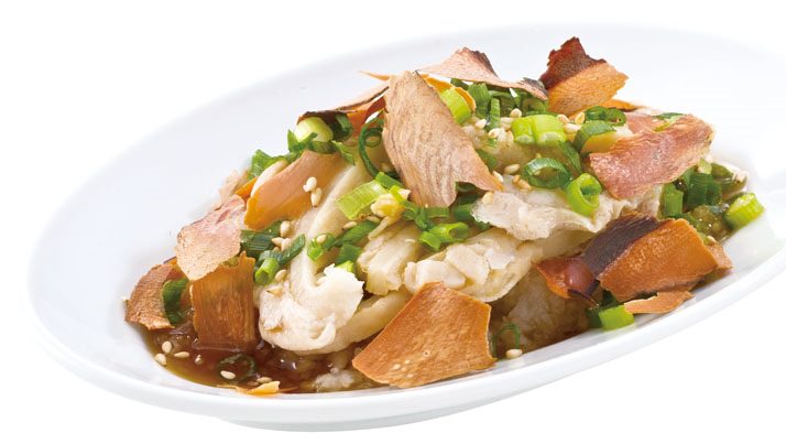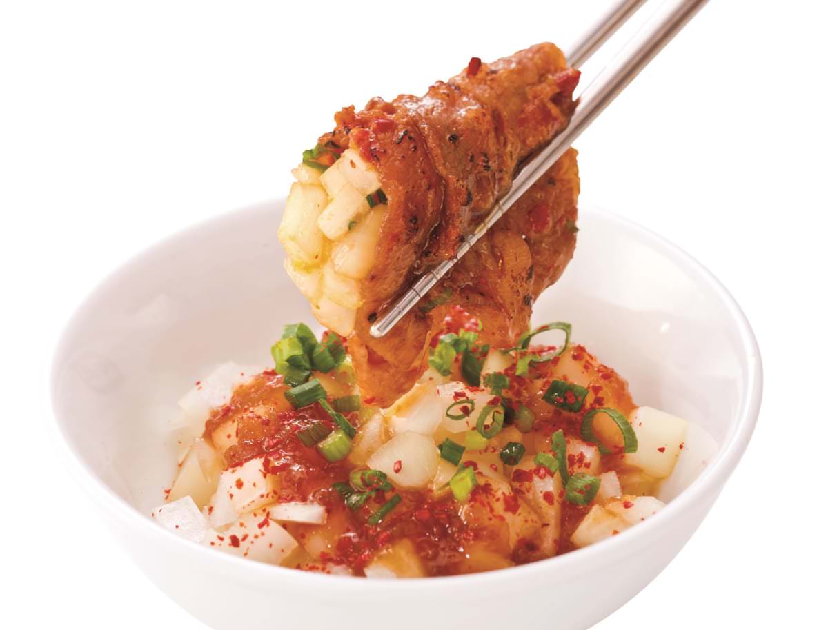 氷温熟成した厚切りのかつお節と旨みたっぷりのホルモンを、焼肉屋のさっぱりポン酢と絡めていただきます。