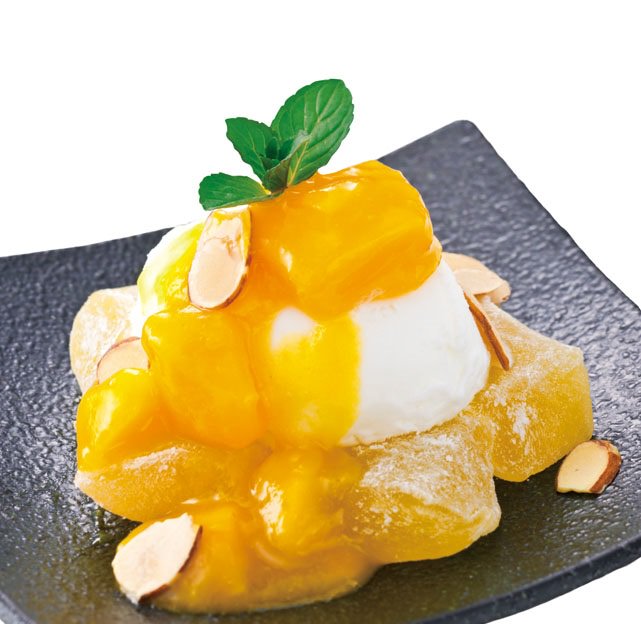 マンゴー味のもちもち“わらびもち”とヨーグルトアイスをあわせたさっぱりスイーツ。