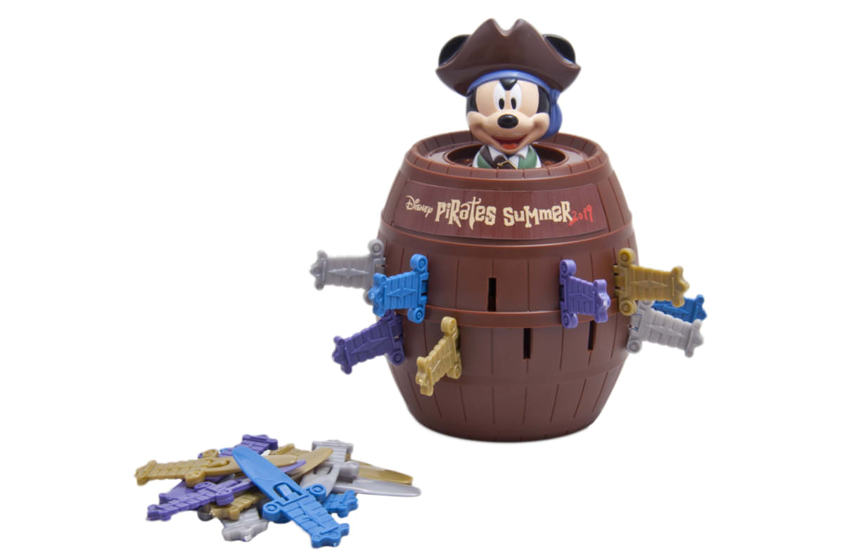 1本ずつ短剣を樽にさしていき、「ミッキーマウス」が飛び出したらゲームオーバーという簡単ルールの楽しいゲームです。