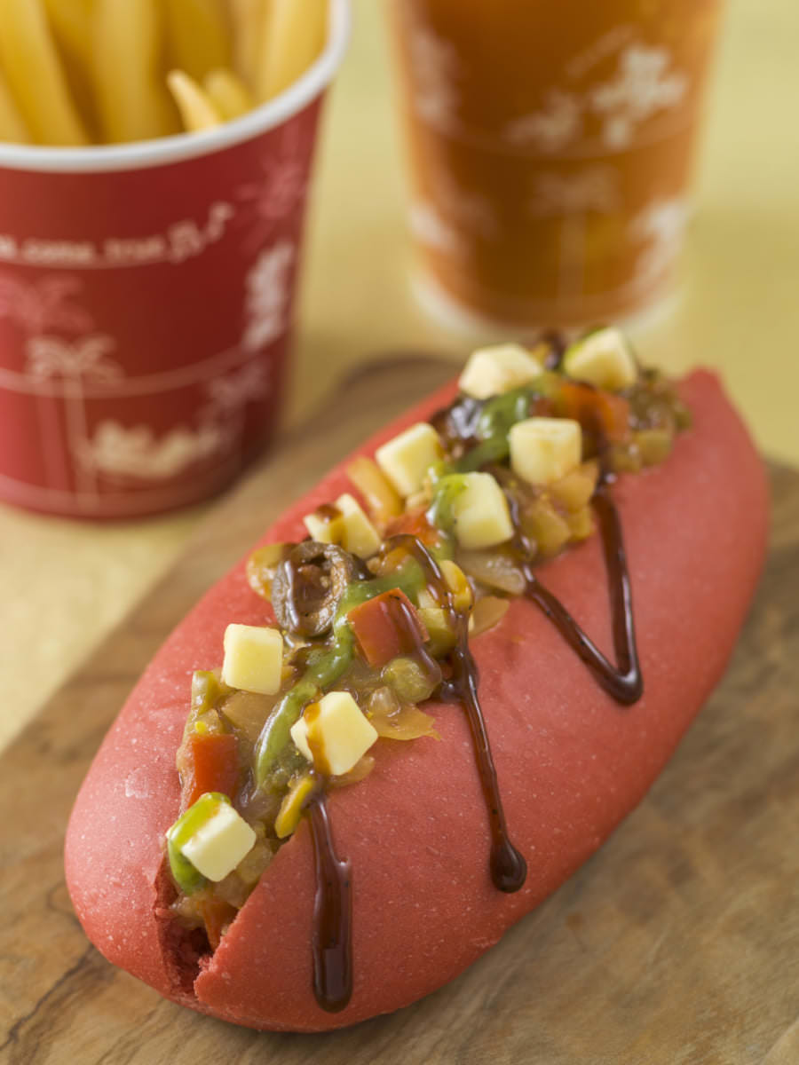 真っ赤なパンに挟まれたジューシーなソーセージは、ダイスカットされたパプリカやオニオン、ハーブなどの酸味が効いたソースと相性抜群です!