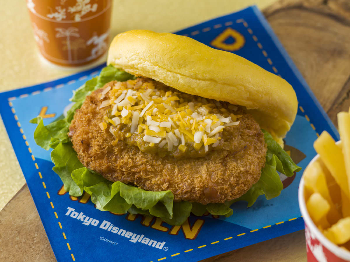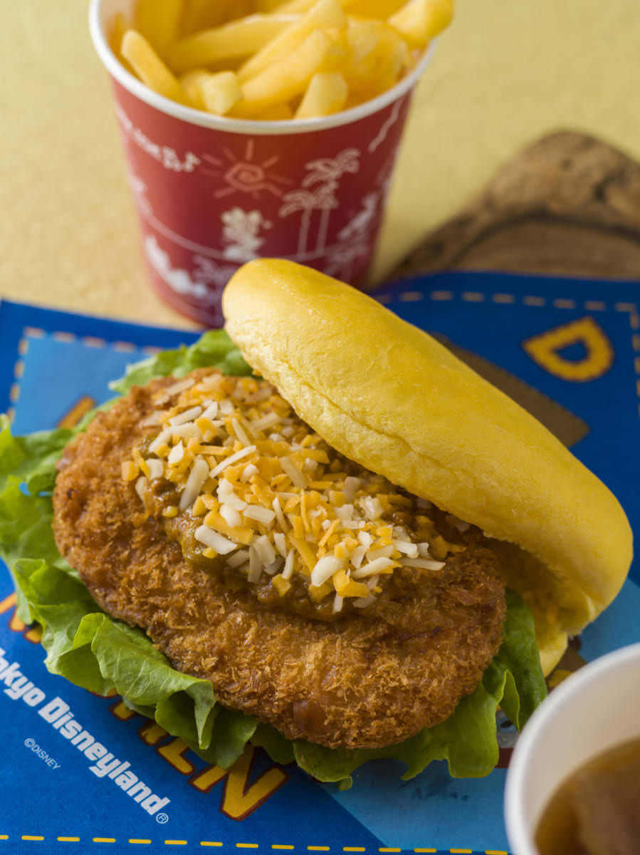 「ドナルドダック」のくちばしをイメージしたバンズにトンカツ、キーマカレー、2種のチーズが挟まれた、がっつり楽しめるフードメニューです☆