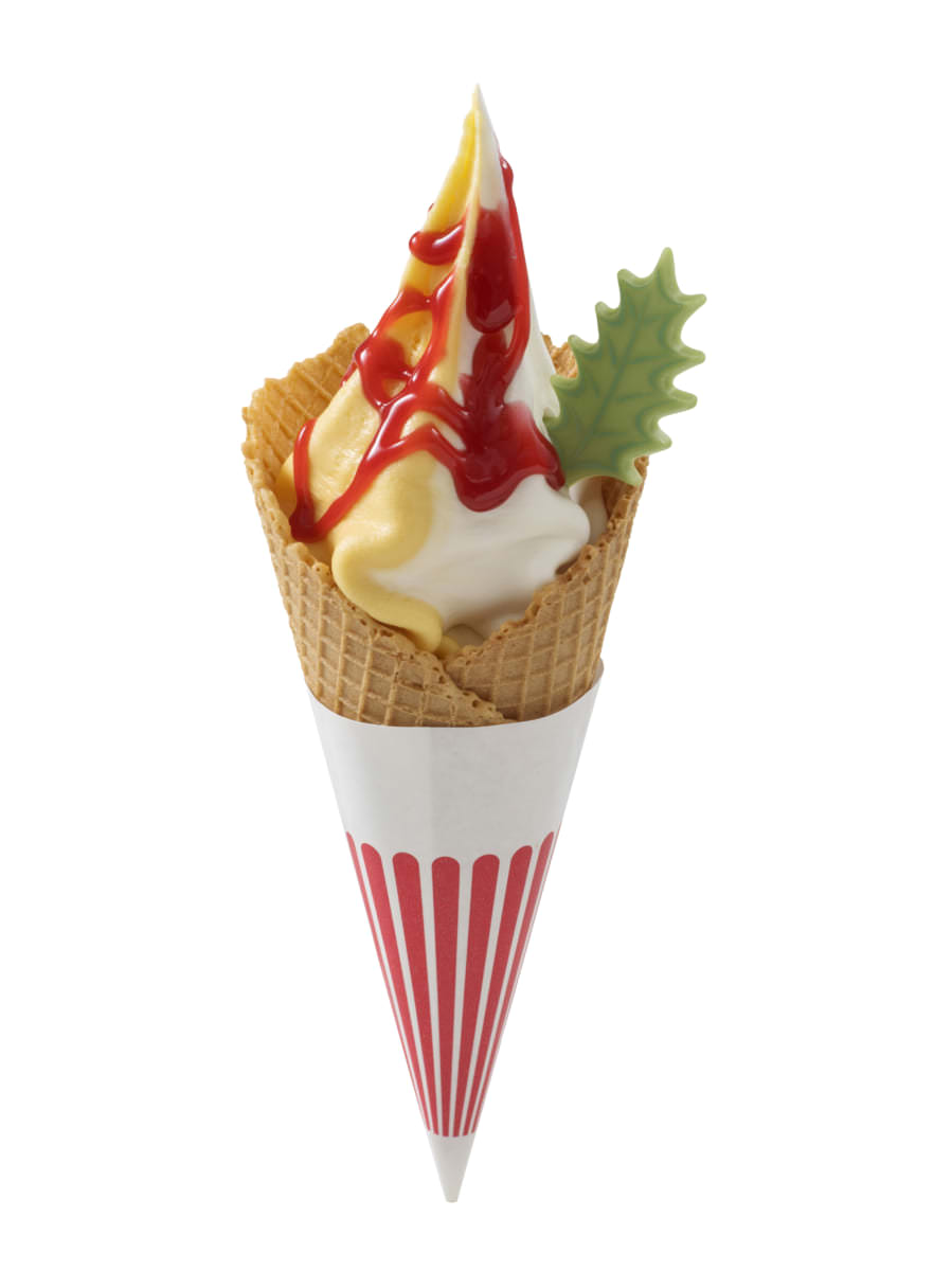 見た目はまるで燃え上がる炎!?のような「マンゴー&ミルクソフトクリーム、ラズベリーソース」