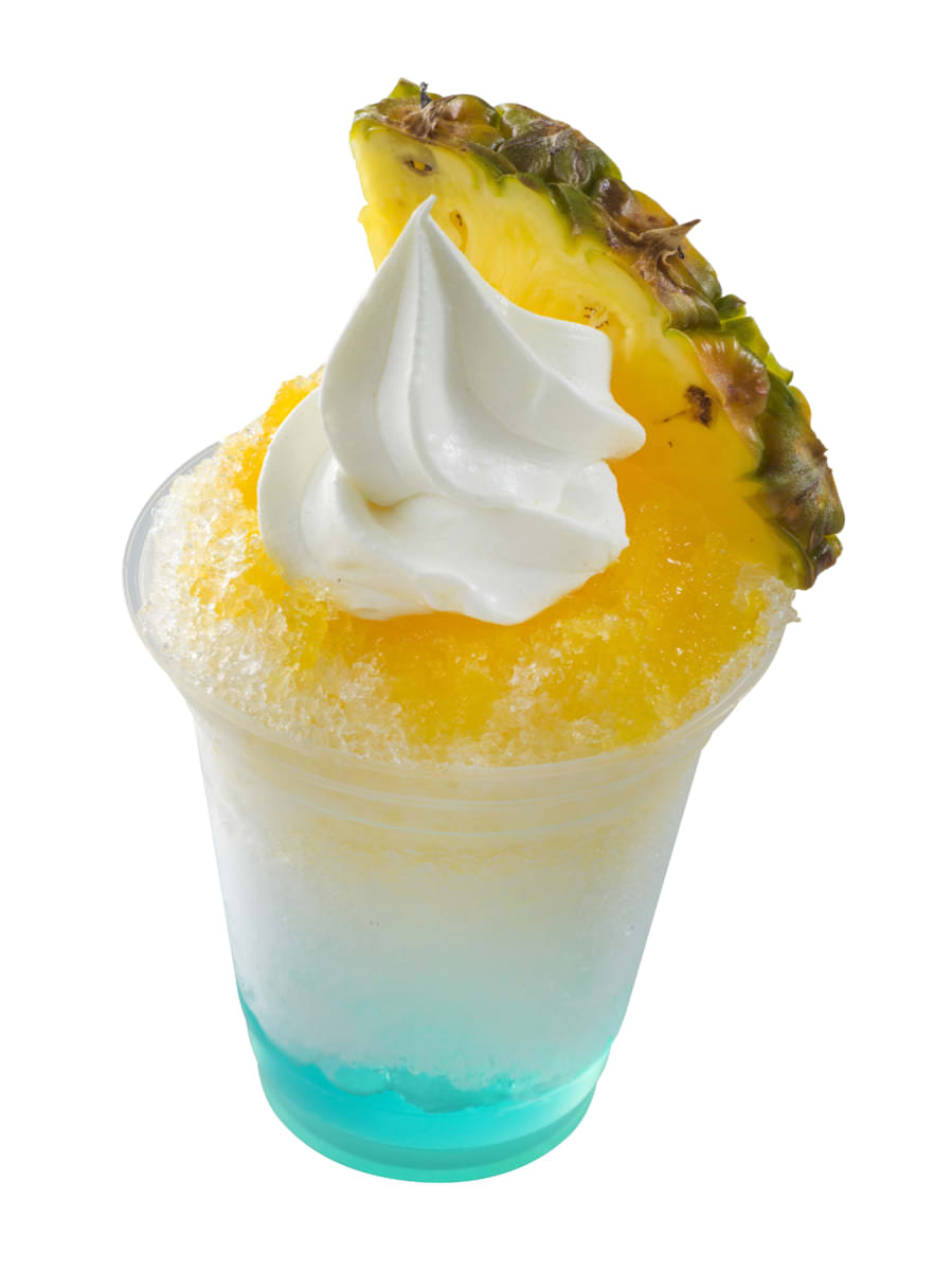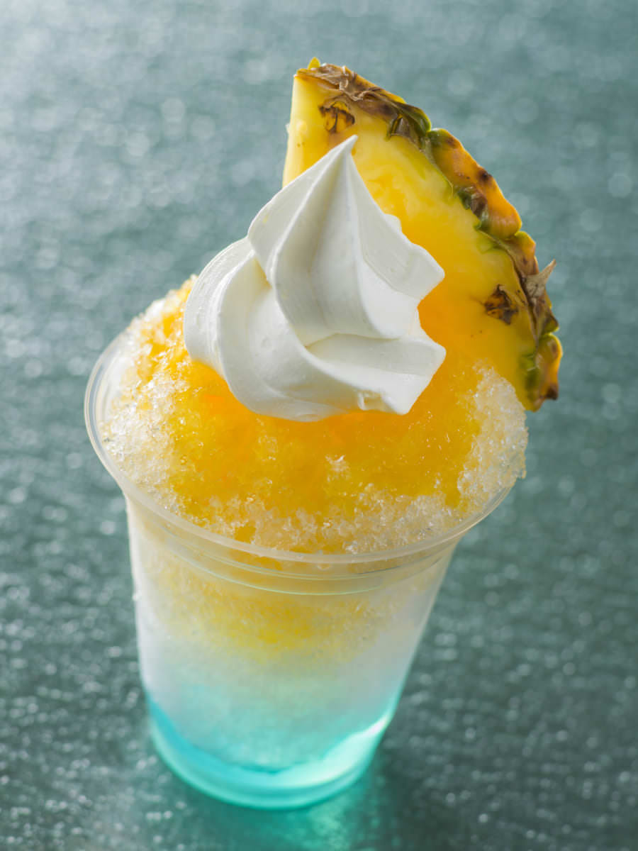 甘く爽やかな風味のシェイブアイスには、ソフトクリームとパイナップルがトッピングされています。