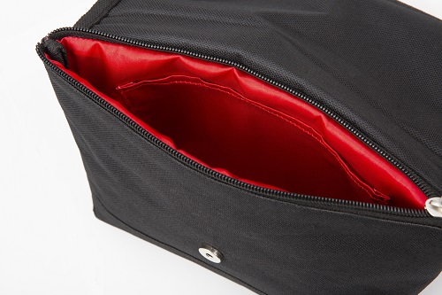 ファスナー式のバッグ内布は情熱的なディープレッドカラーで統一。