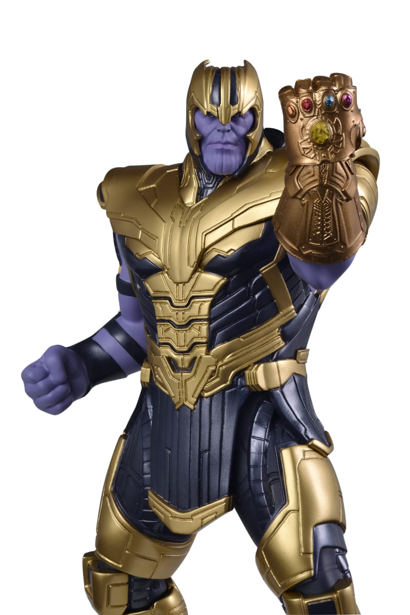 ゴールドのアーマーやブーツ、「サノス」を象徴する紫色の肌などが、細部までリアルに再現されています。