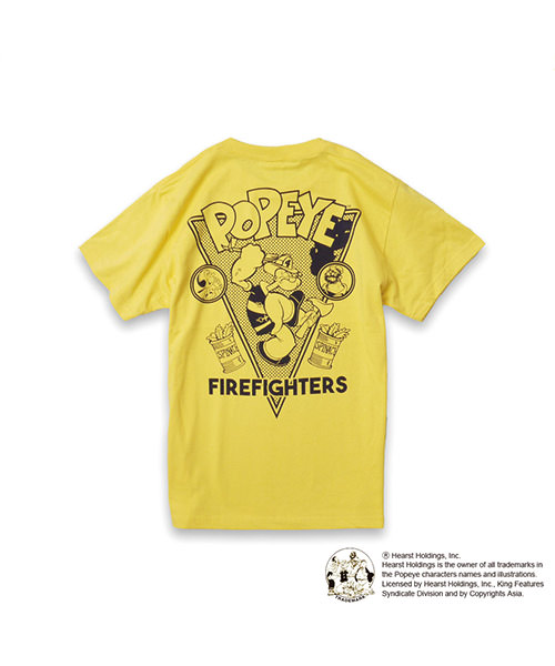 バックには消防服を着た「ポパイ(TM)」と、力の元となるほうれん草、恋人の「オリーブ・オイル(TM)」恋敵「ブルート」がプリントされています。