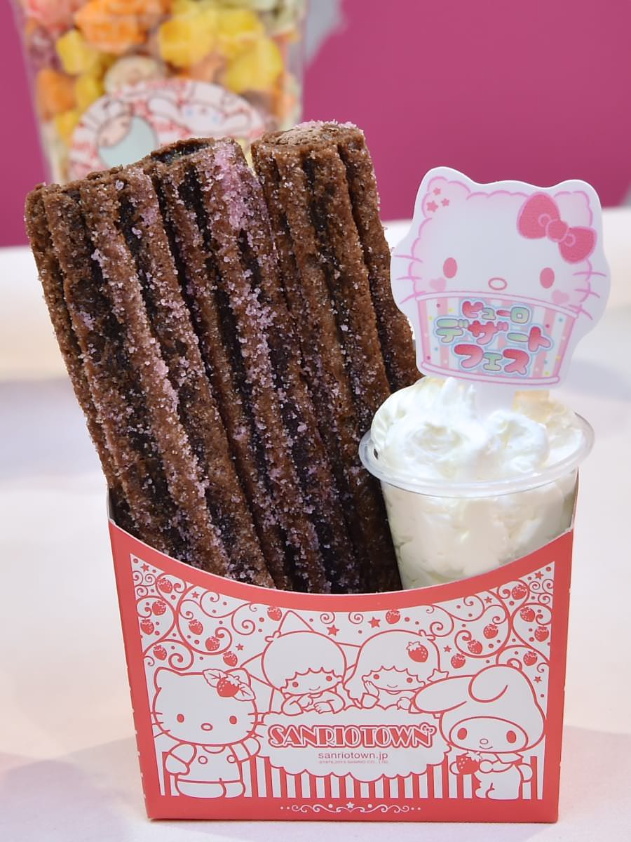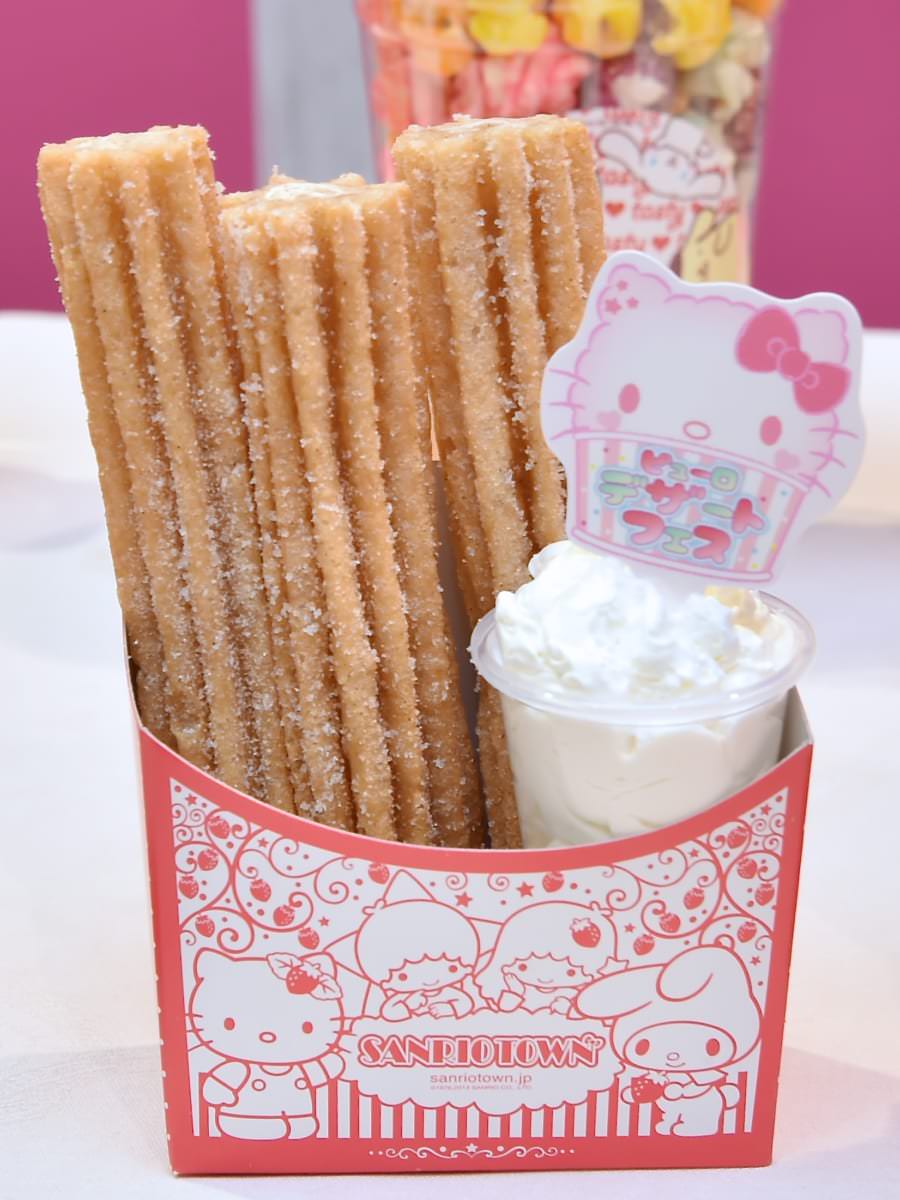 「ハローキティ」や「マイメロディ」「リトルツインスターズ」が描かれたカップに入ったチュロスの塩キャラメル味。