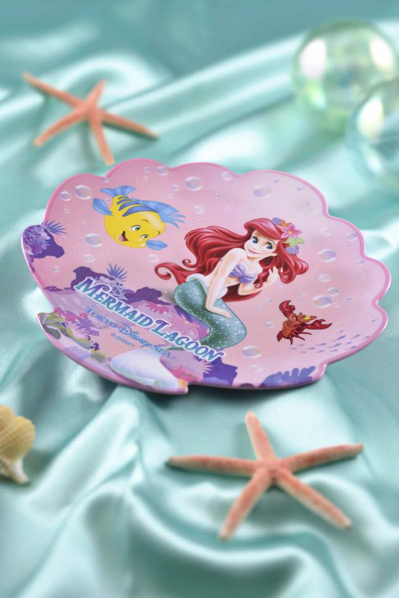 ピンクのシェルモチーフに、「アリエル」、「セバスチャン」、「フランダー」がデザインされているオシャレなプレート。