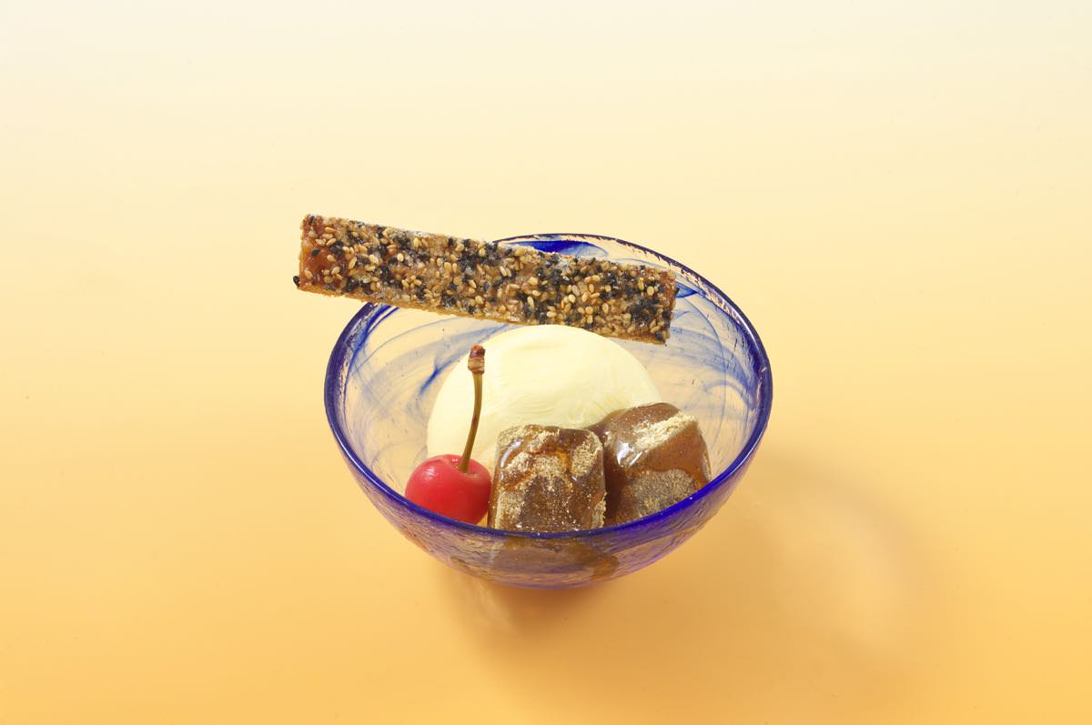 ぷるぷるのわらび餅が添えられたバニラアイスクリーム。