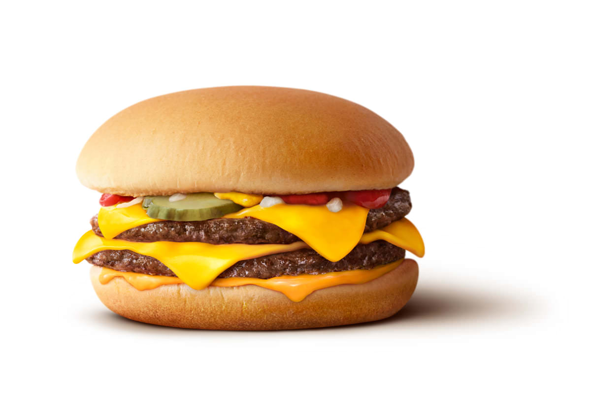 2枚のジューシーな 100%ビーフパティとチェダーチーズのコクのある旨み、オニオンの食感とピクルスのほどよい酸味、さらにケチャップの甘みとマスタードでバランスを整えてある、多くの人に愛されているマクドナルドの定番商品です。