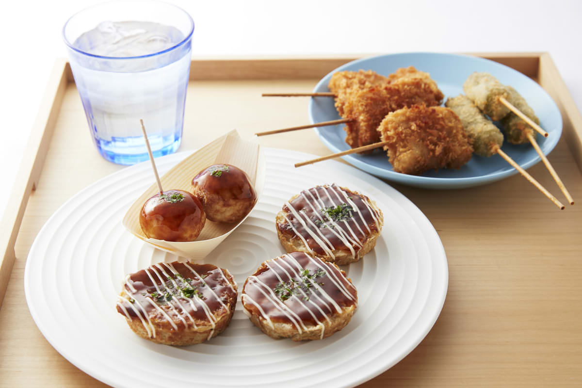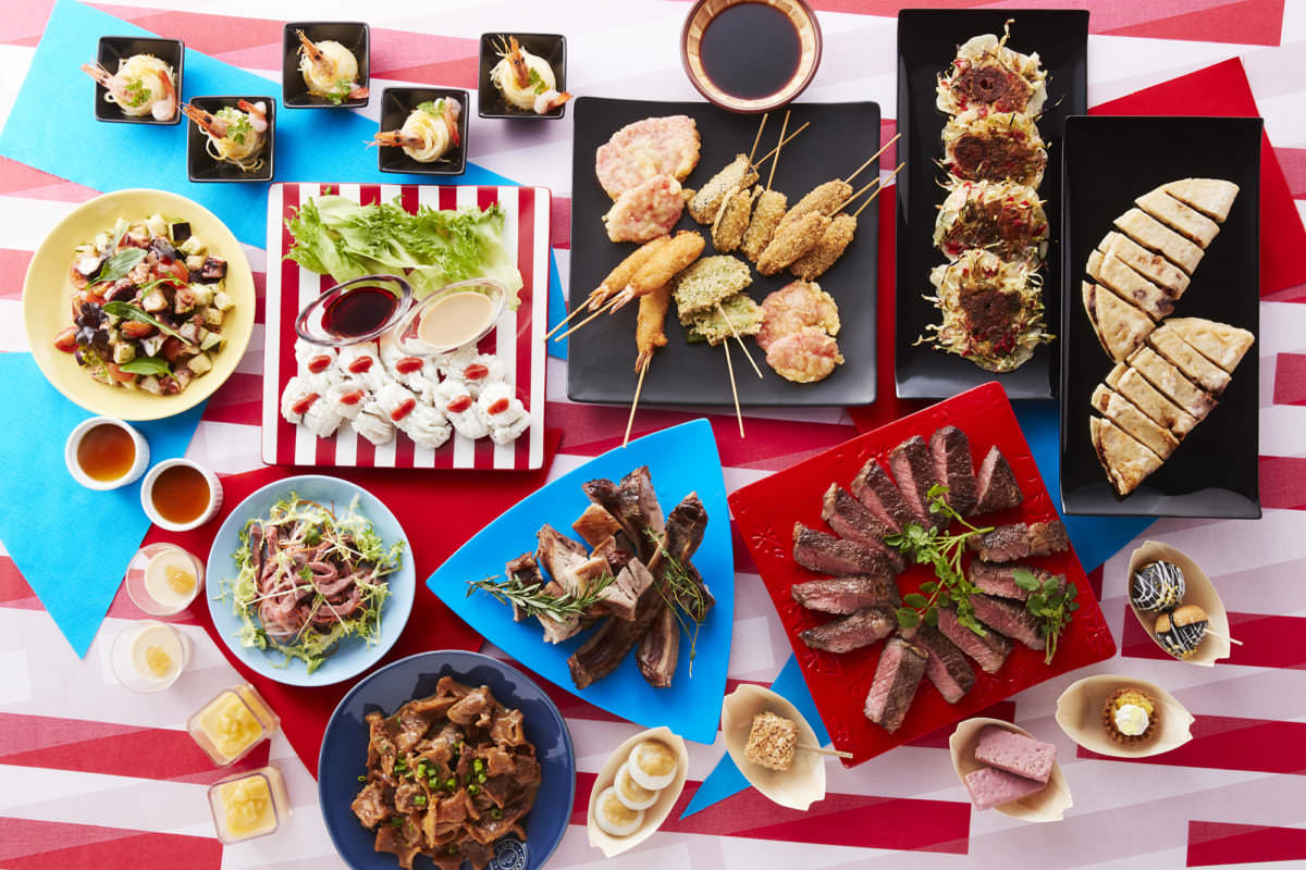 串カツ(牛、海老など5種)/鱧のしゃぶしゃぶ/いか焼き/どて焼き/紅しょうがの天ぷら/洋食焼き/きつねうどん/水茄子とタコのサラダ/ホルモンカレー/ミックスジュースのババロア/岩おこしのルビーチョコ包み/パイナップル飴のタルト/冷やしあめのパンナコッタ など