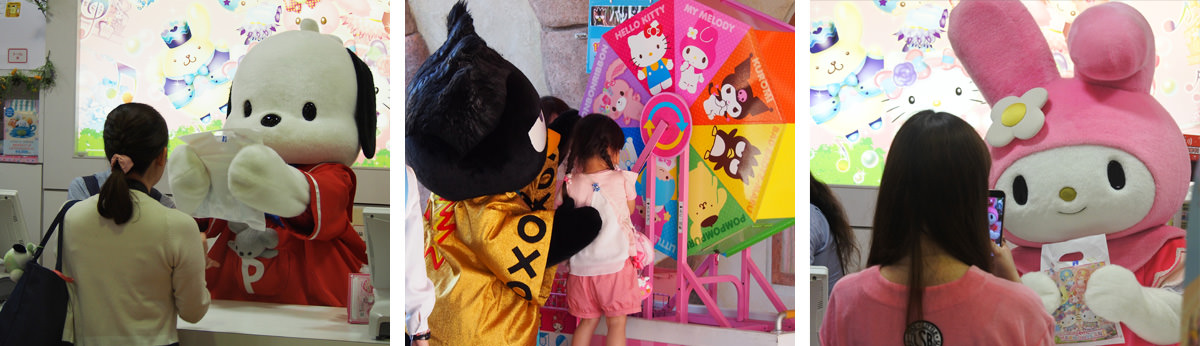 期間中、マイメロディやバツマル、ポチャッコなど人気キャラクターがショップやゲームのお手伝いにやってきます!