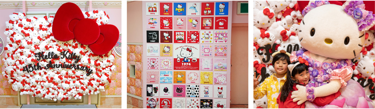 たくさんのハローキティのぬいぐるみでできたフォトスポットや、ハローキティが誕生した1974年から2018年までのヒストリーデザインパネルが展示されています。
