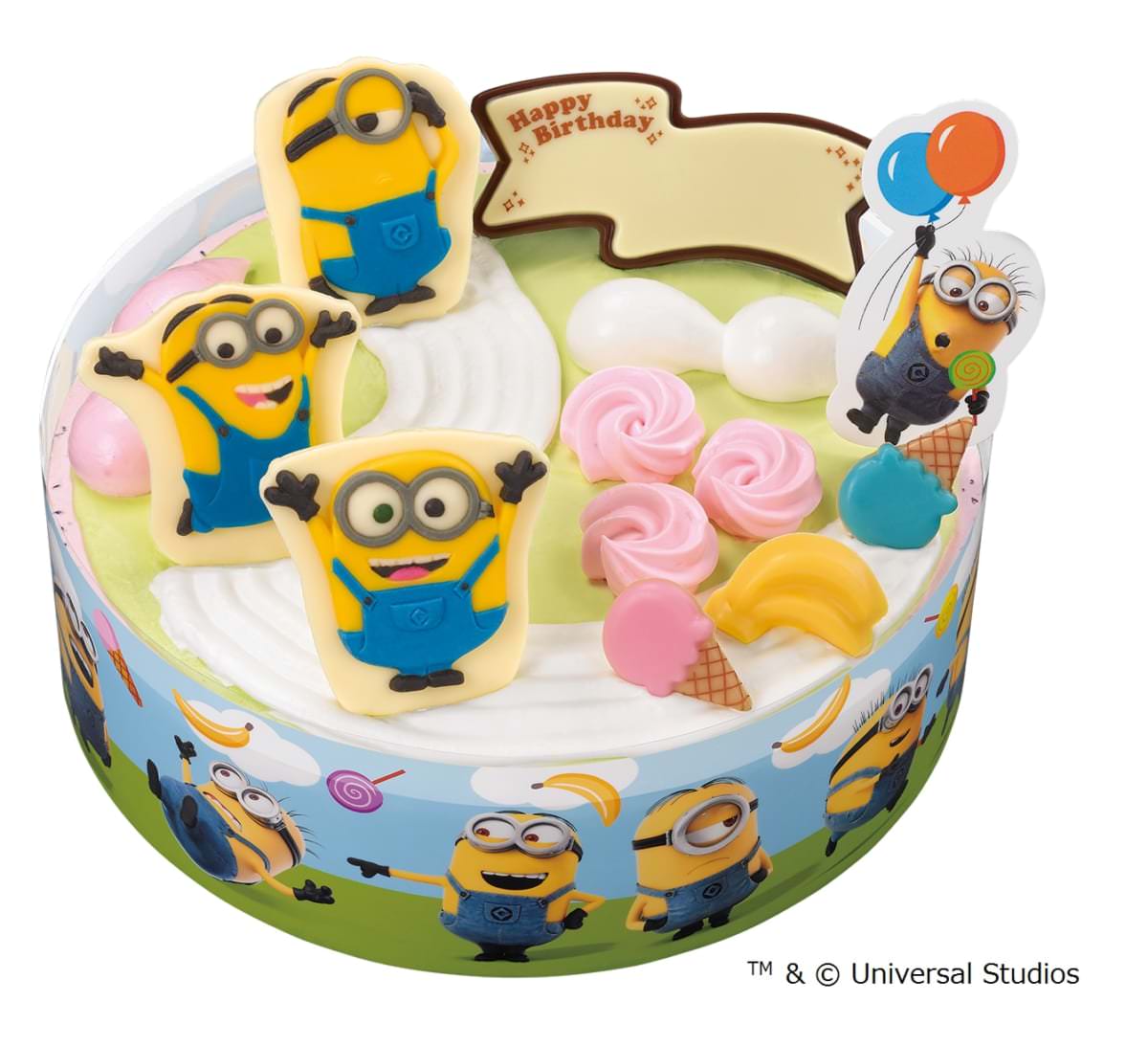 丘を転がるアイスクリームやバナナを一目散に追いかける“ミニオン”たちや、バルーンを持った“ミニオン”のピックなど、たくさんの“ミニオン”が登場するアイスクリームケーキ。
