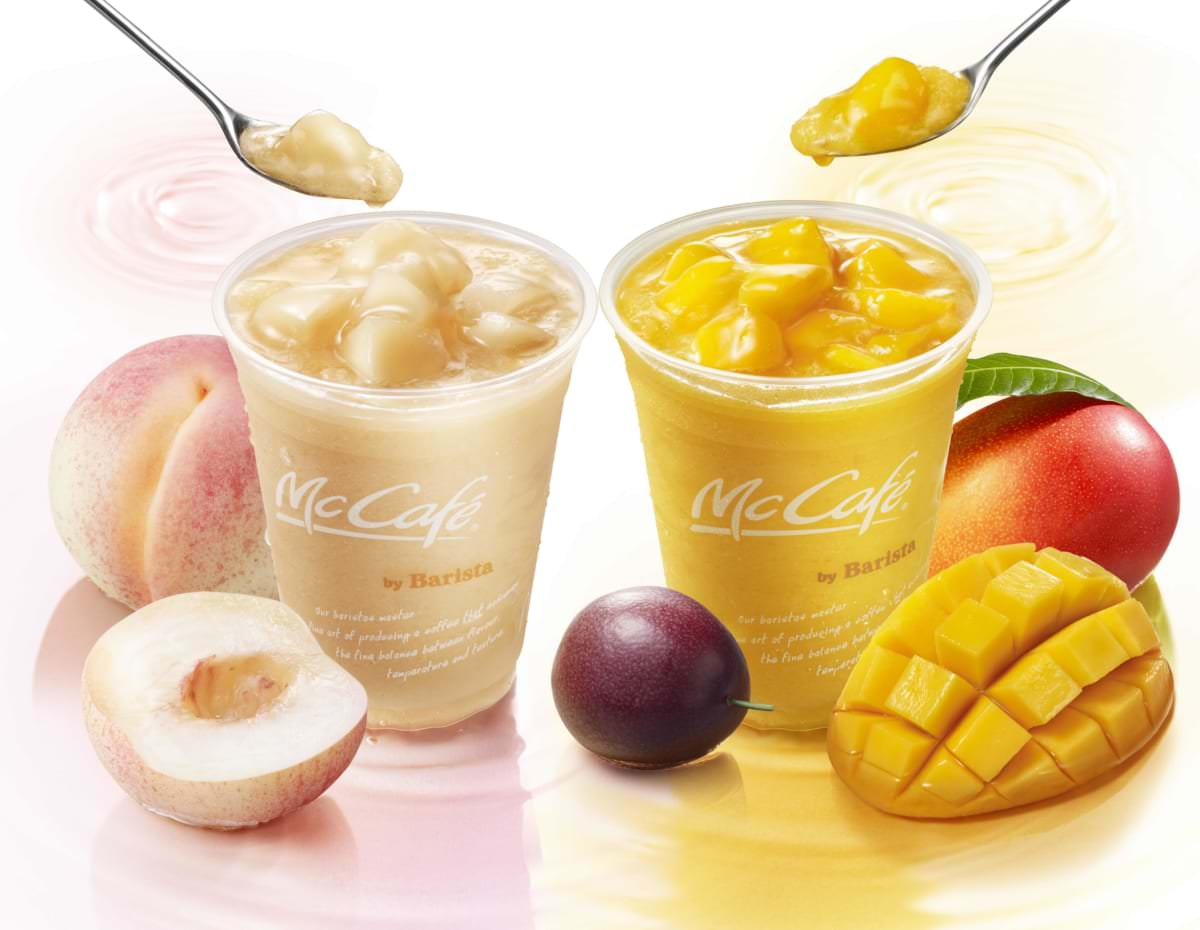 マクドナルド専任バリスタが「本格カフェコーヒー」を提供するコーナー“McCafé by Barista”(マックカフェ バイ バリスタ)から、夏季商品「桃のスムージー」と期間限定商品「マンゴー&パッションフルーツスムージー」が登場!