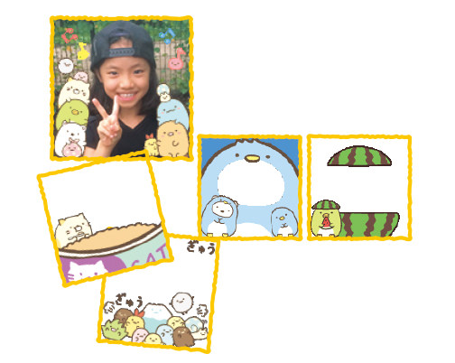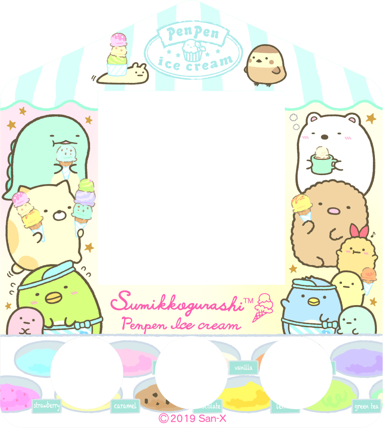 すみっコフレーム(すみっコたちが描いてあるデザインフレーム)を使っての写真撮影&保存をすることができます。
