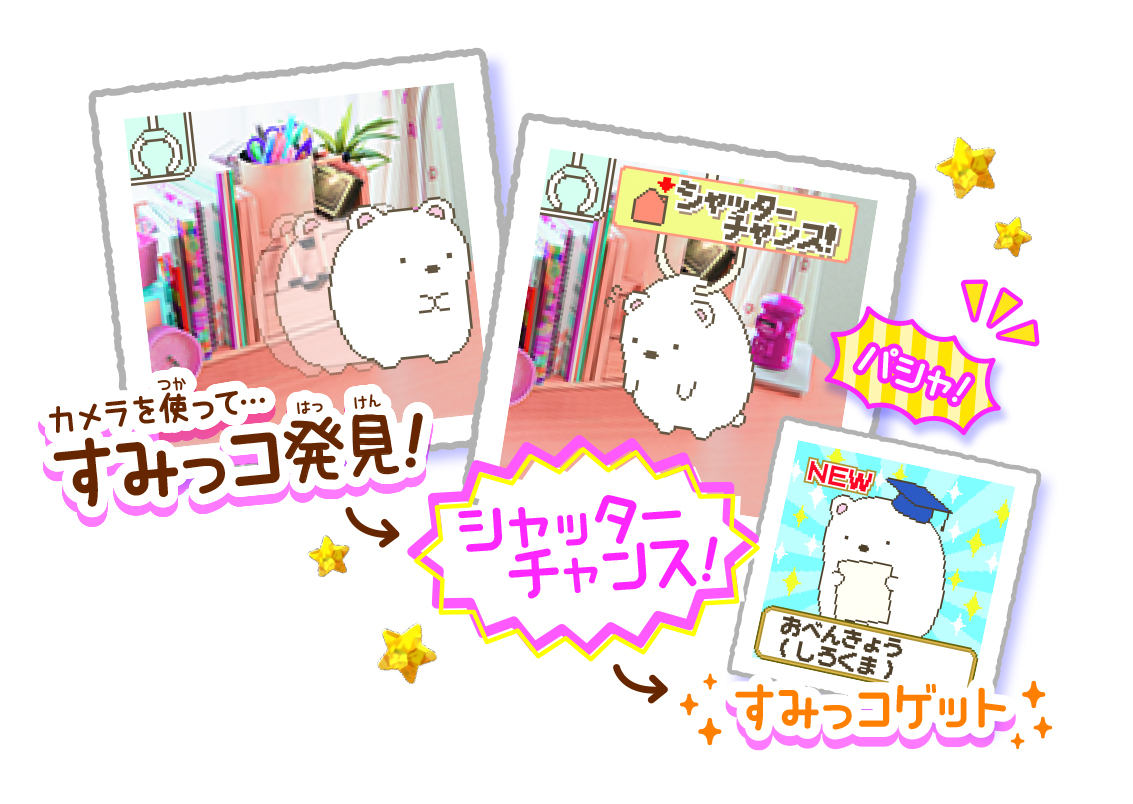 カメラ機能により、日常空間にあらわれる「すみっコ」や「みにっコ」を撮影してゲットできます。