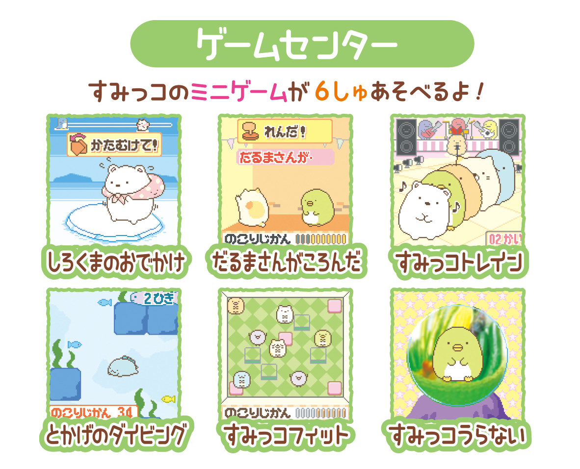 本体を左右に動かしたり、本体を傾けたりすると画面が連動し、「すみっコ」や「みにっコ」をさがしたり、ゲームをしたりなど様々な遊びをすることができます。