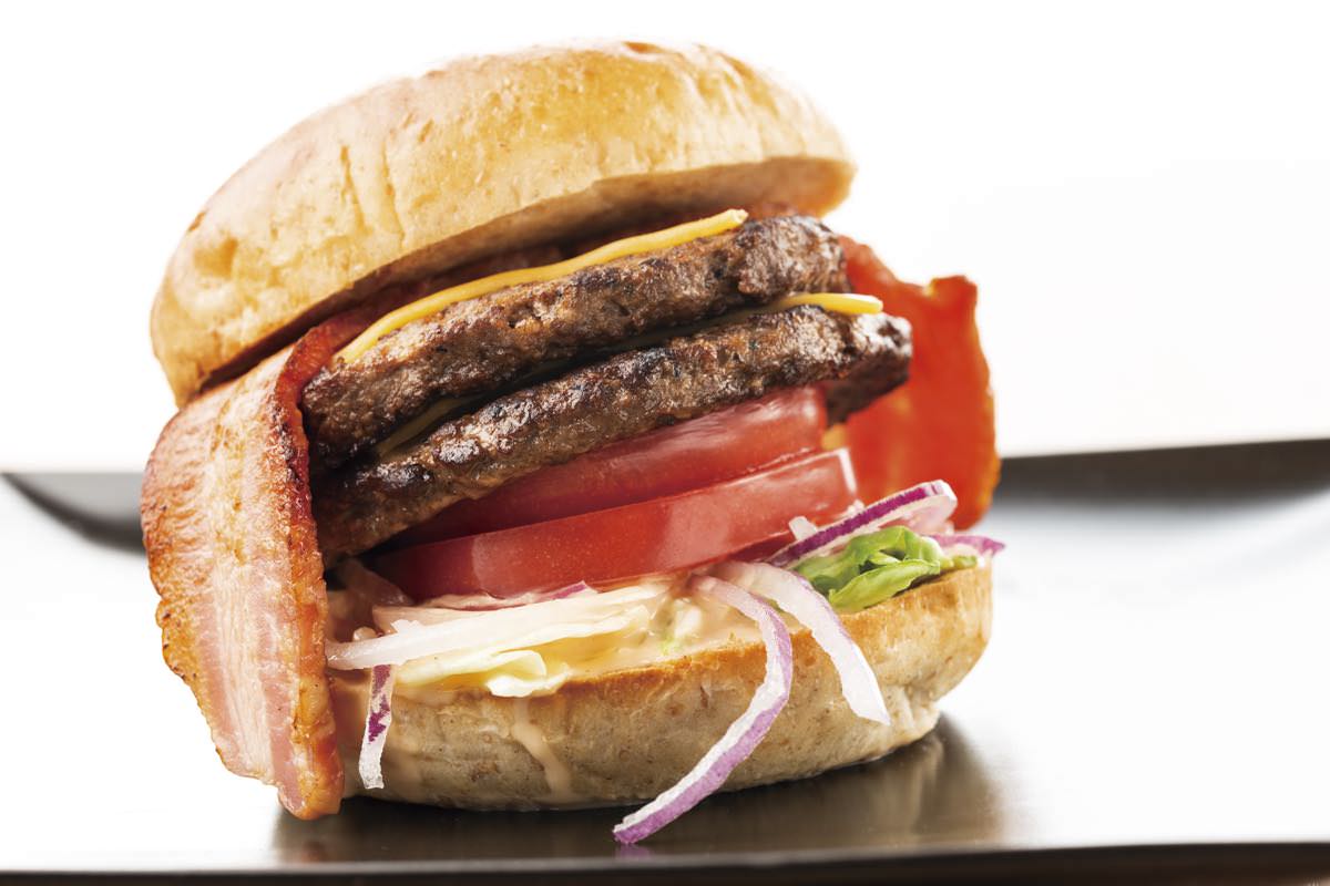 トマトやチーズ、ベーコンなどの色とりどりの具材と一緒にバンズで挟まれた、ボリューム満点のハンバーガーです。