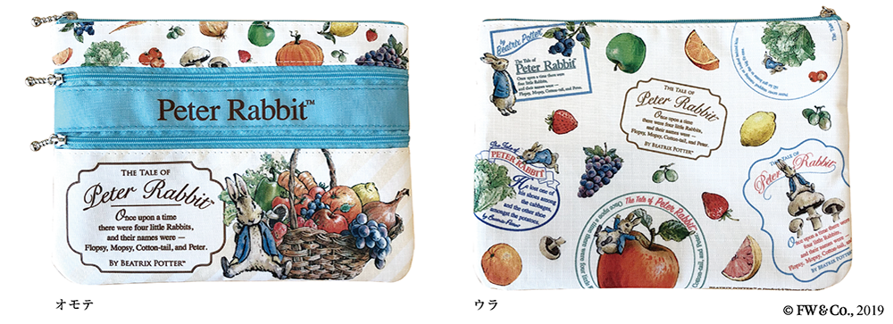 ピーターと、いとこのベンジャミン・バニーを色鮮やかな果物や野菜とともに描いた水彩画を元に 、白色と水色を基調に爽やかなデザインのグッズです。