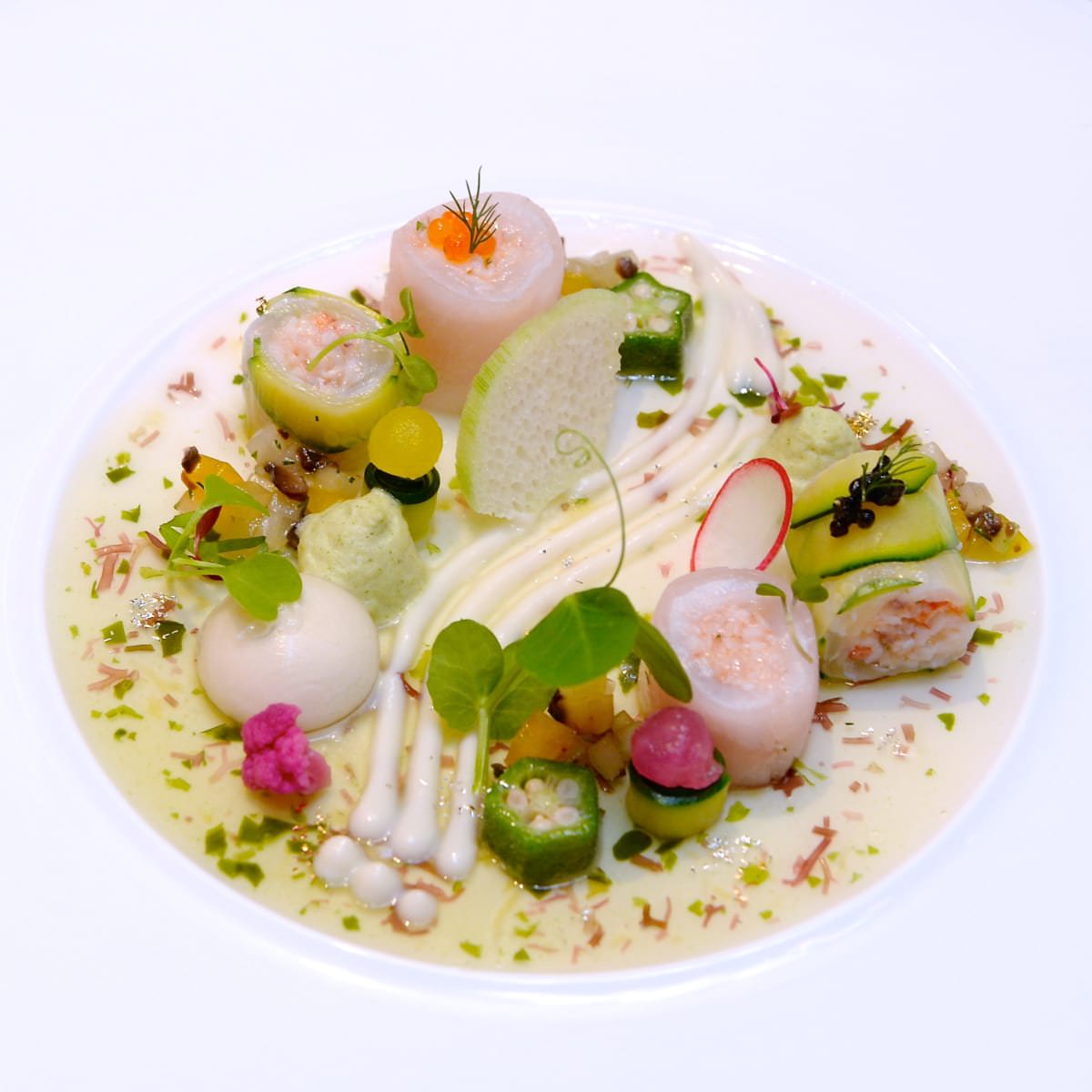 • ライチーと冬瓜の冷たいポタージュ カダイフを纏ったラングスティーヌのフリット