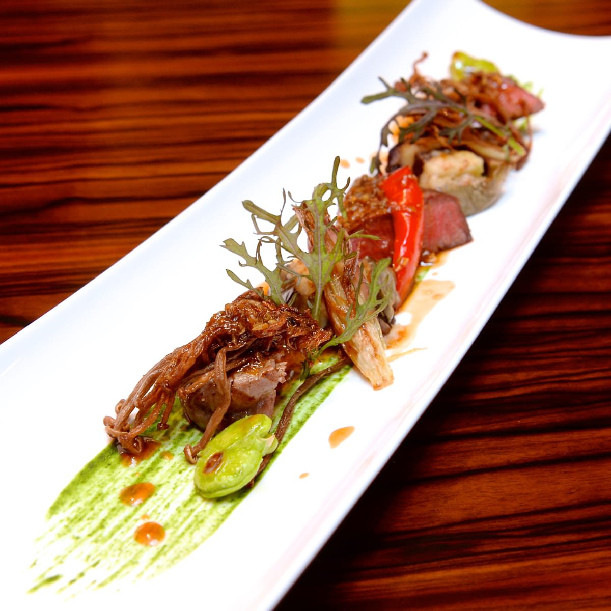 その上に香ばしくグリルされた牛テンダーロインと素揚げされたソラマメやブラウンエノキなどの野菜が盛り付けられており、ワインベースのベルシーソースでまとめられています。