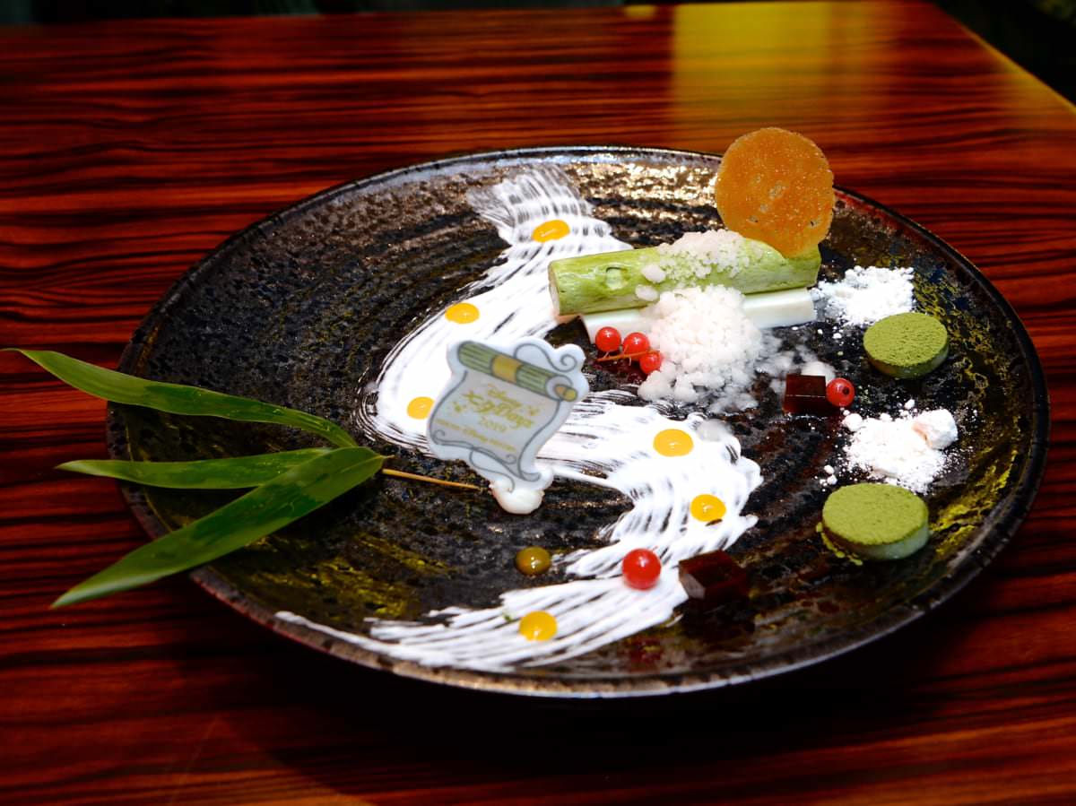 流れるように美しく描かれた緑色のソースは、笹の葉のパウダー入り。