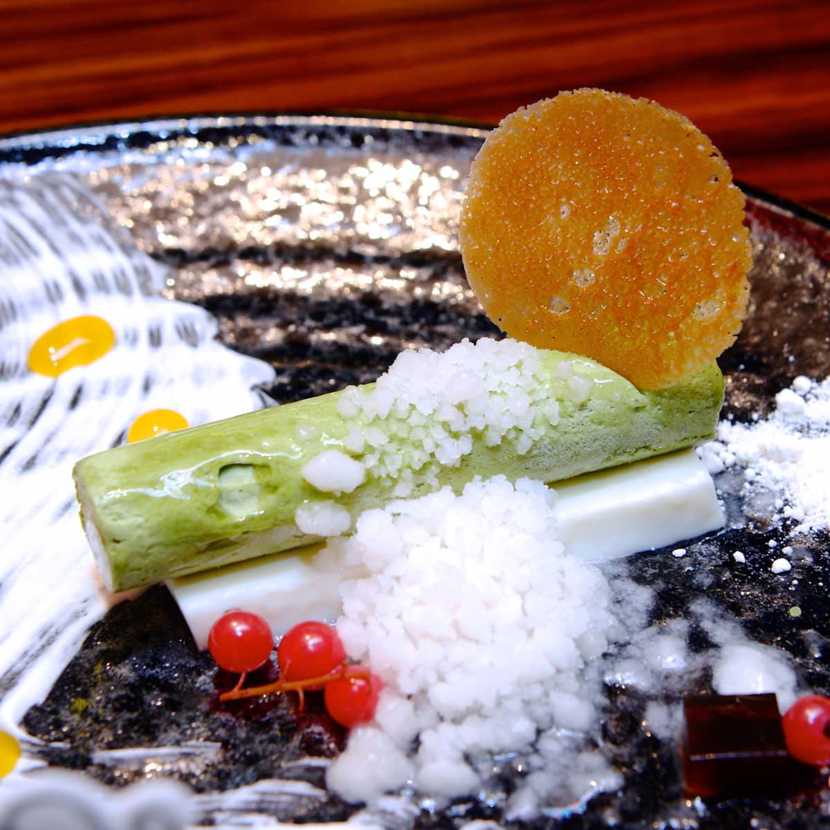 ホワイトチョコレートのブランマンジェと抹茶のパルフェ 桃のグラニテを添えて 砂糖菓子