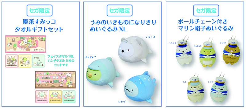 セガ限定「すみっコぐらし 喫茶すみっコタオルギフトセット/すみっコぐらし うみのいきものになりきりぬいぐるみXL/すみっコぐらし ボールチェーン付きマリン帽子ぬいぐるみ」